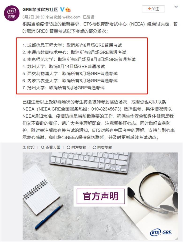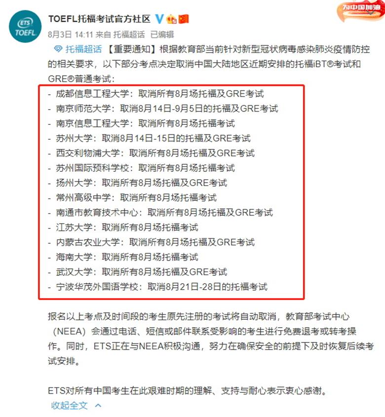 除了雅思,托福、GRE也相继发布取消部分线下考点的通知: