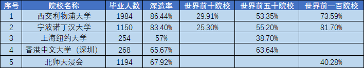 比如清华大学同年的深造率是78.3%,出国(境)高校是QS世界排名前五十的比例为19.17%,低于上述几所中外合作大学的比例。
