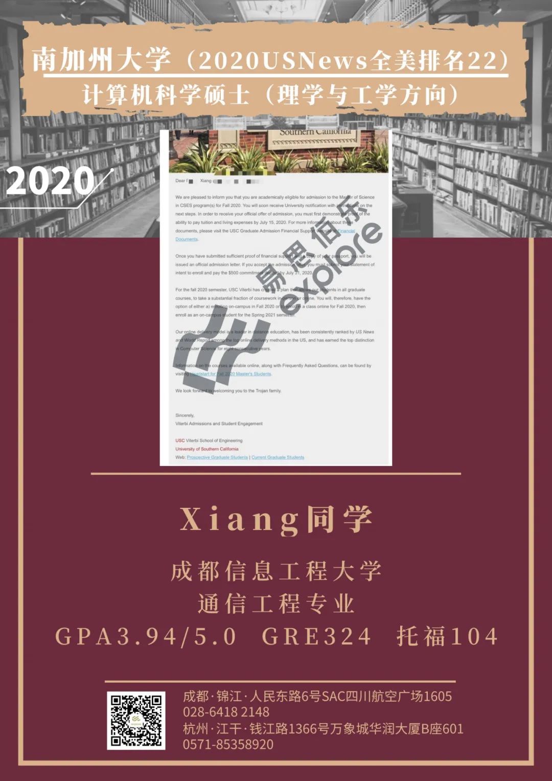 终在疫情期间打败众多竞争者斩获了美国名校南加州大学MS in CS -Scientists and Engineers项目的录取。