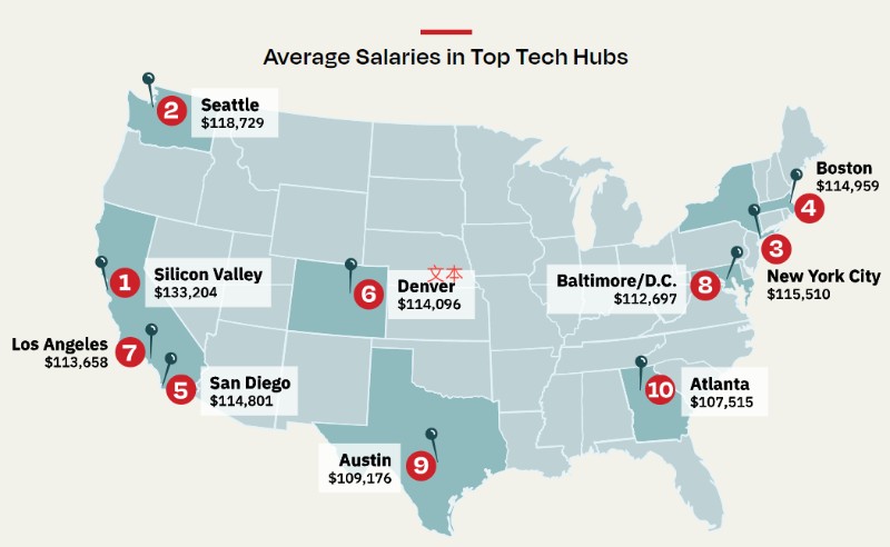 如最新的Dice薪资报告所述,西雅图和硅谷等成熟的科技中心以及奥斯汀和亚特兰大等新兴城市在过去一年里,其技术人员的薪资都有显著增长。