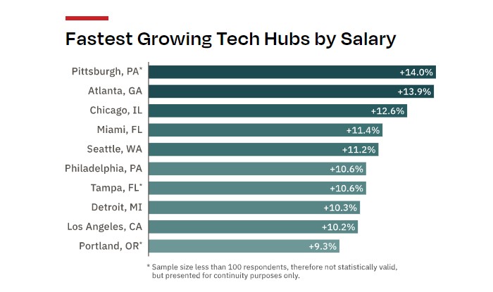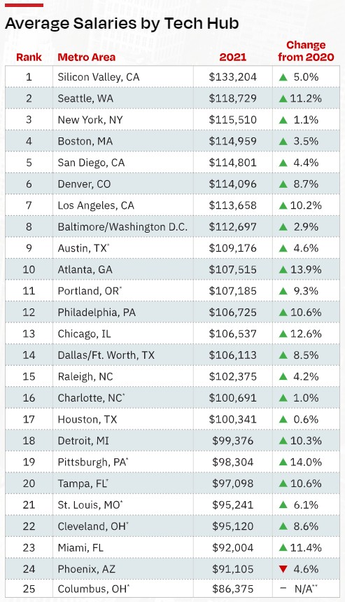 在2020-21年期间,西雅图(增长11.2%)和硅谷(5.0%)的工资显著增长,纽约市(1.1%)和波士顿(3.5%)的工资略有增长,这表明这些成熟的中心城市的需求仍在继续。