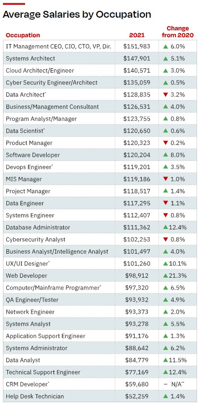 但在2020年至2021年期间,一些高度专业化、需求旺盛的职业的工资也略有下降,例如,网络安全分析师跌0.8%,至102,253美元;数据工程师跌1.1%,至117,295美元,其他“热门”技术专家职位的薪资水平保持不变。