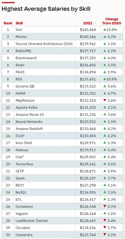 这就是为什么相对而言很少有技术人员专门从事Solr(142,464美元,同比增长15.8%)或 Service-Oriented Architecture(139,961美元,同比增长5.1%)等企业搜索平台,加上技术人员的背景和经验,他们能拿到如此高的薪水。