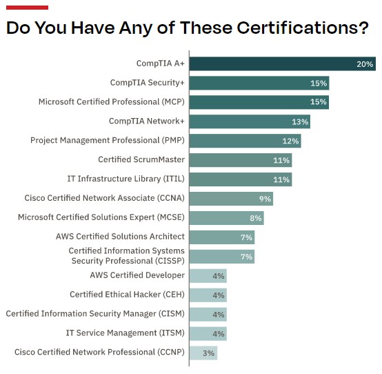 与往年一样,最受欢迎的认证包括CompTIA A+(20%)、CompTIA Network+(13%)、CompTIA Security+(15%)、Project Management Professional(PMP)(12%)和ScrumMaster认证(11%),换句话说,基础设施和网络安全认证仍然很受欢迎,而且肯定是许多专门从事建立、维护和保护技术堆栈的企业的要求。