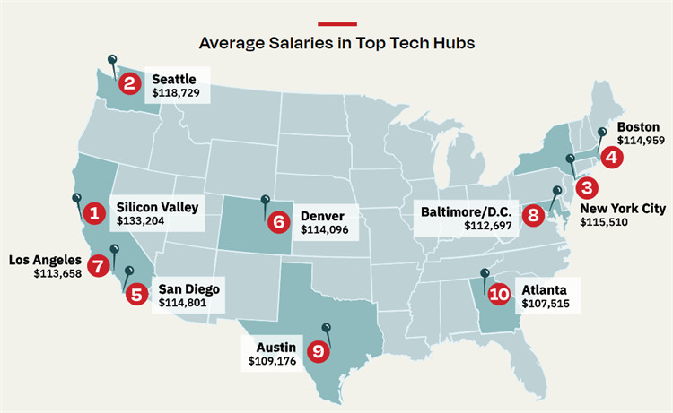 如Z新的Dice薪资报告所述,西雅图和硅谷等成熟的科技中心以及奥斯汀和亚特兰大等新兴城市在过去一年里,其技术人员的薪资都有显著增长。