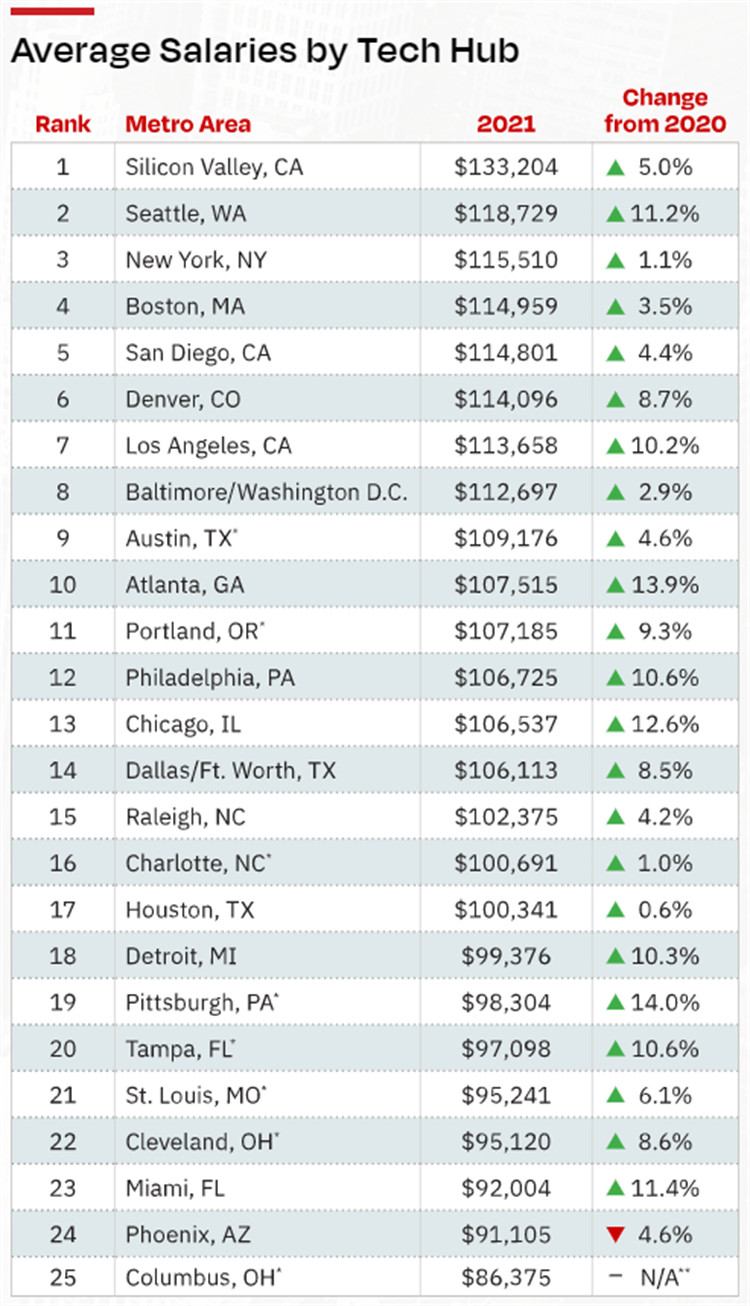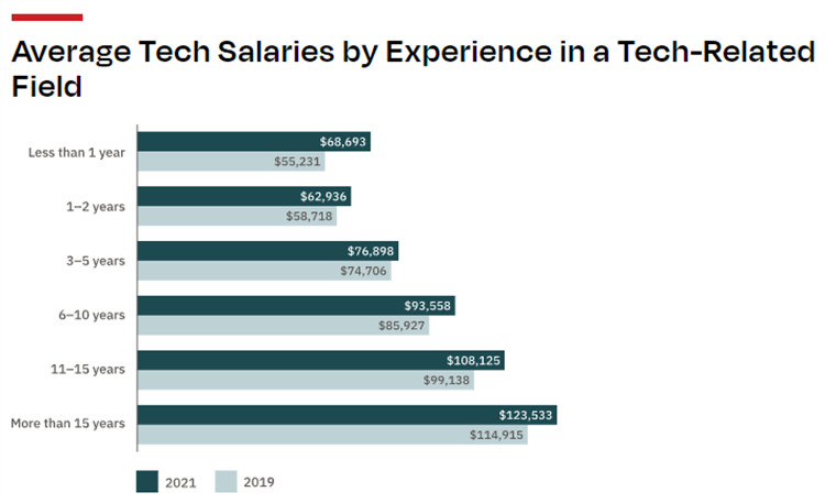 2021年全年,科技行业失业率保持低位,至10月降至2.1%,对人才的需求导致技术人员的平均工资在2020年至2021年期间增长了6.9%,达到104,566美元,这是Dice薪酬报告记录的Z高薪酬,对于技术人员来说,从他们技能和经验的价值来看,这是一个积极的信号。