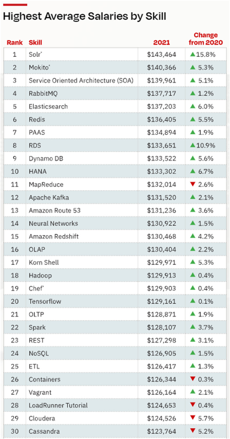 这就是为什么相对而言很少有技术人员专门从事Solr(142,464美元,同比增长15.8%)或 Service-Oriented Architecture(139,961美元,同比增长5.1%)等企业搜索平台,加上技术人员的背景和经验,他们能拿到如此高的薪水。