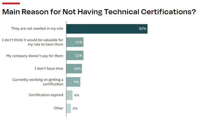 具体来说,在那些表示自己没有证书的技术人员中,52%的人认为他们的工作不需要证书,这一比例高于2020年的51%和2019年的48%,与此同时,只有11%的技术人员表示,他们认为认证对他们目前的工作岗位没有价值,这一比例略低于2020年(12%持相同观点)和2019年(14%持相同观点)。