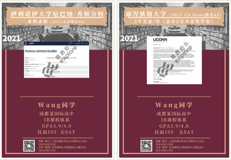 Wang同学的梦校是纽约大学,也选择了ED申请纽约大学。但由于疫情期间,无法参加SAT考试,单凭105分的托福在强者如云的纽约大学并没有很大的竞争力,所以学校一开始把她放入了等待名单。但我们不想轻易放弃学生的梦校,和学生沟通之后,写了一封诚意满满的争取信,并在信中加入了她在学校做过的学术项目,结果功夫不负有心人,Wang同学获得了梦校纽约大学的录取。此外,她还获得了UCD、UCSC、康涅狄格大学、UIUC和多伦多大学的录取。