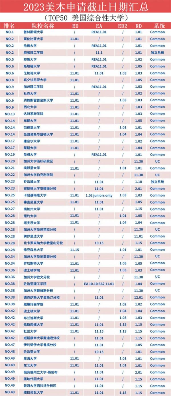 下文中,小E学姐整理了TOP50美国综合性大学&TOP40美国文理学院的申请截止日期,但在了解各院校具体申请截止日期之前,我们同时了解一下美本申请中ED、EA、RD和RA,4个申请轮次吧!