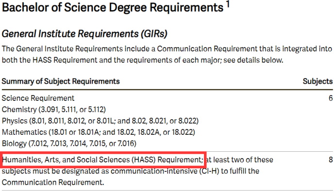 除了选修课外,在很多美国大学的本科教育中,学生还经常被要求选择一个跨学科的专业课程,以扩展自己的知识面和技能。以麻省理工学院(MIT)为例,它的STEM学科在全球享有盛誉,但其实学生学的不仅仅是理工,学生每学期都要在人文,艺术或社会科学领域至少修一门课程。