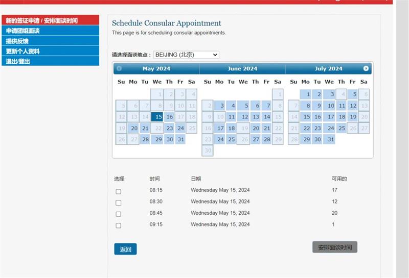 目前北京可预约时间(图源:usvisaservice)
