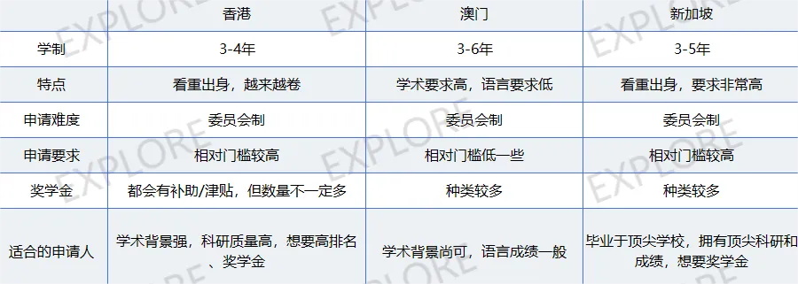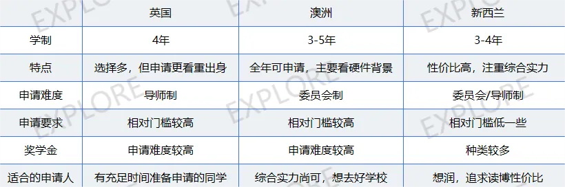 首先,我们为大家整理了不同国家/地区博士的特点、学制、费用、难度等信息,方便各位同学能够快速、定位到适合自己的申请国家/地区。