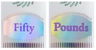 其次,晃动钞票可以发现在钞票左侧的全息图像,正面与背面透视观察可见不同的颜色效果,且在正面透明视窗下方英文面额数字与“Pounds”字样交替变化,呈现彩虹效果。
