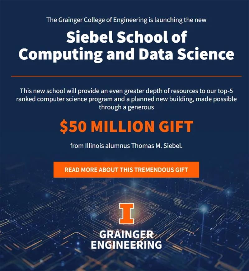 早在今年4月,UIUC(伊利诺伊大学香槟分校)官宣将成立新的计算机与数据科学学院,The Siebel School of Computing and Data Science,并表示要把Grainger工程学院计算机系的项目转移到这个新学院。