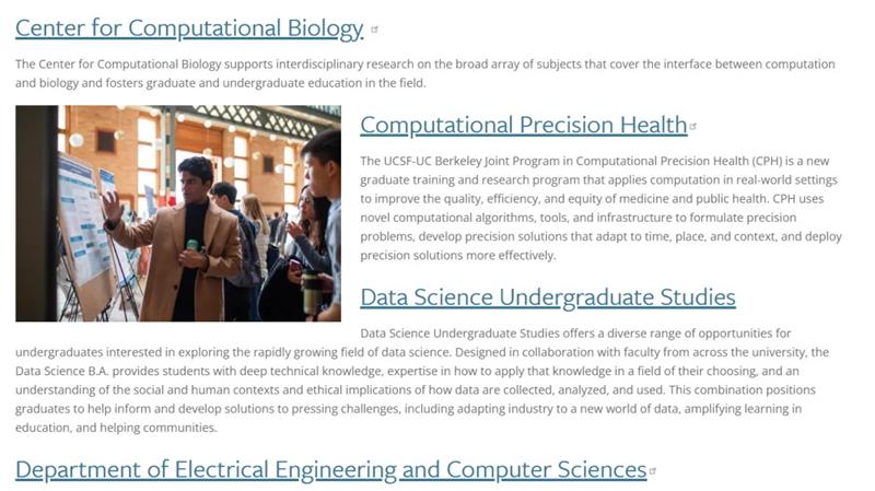 该学学院与工程学院共享电气工程和计算机科学系,与社会科学部共享社会科学数据实验室(D-Lab),与UCSF共享计算精度健康项目。