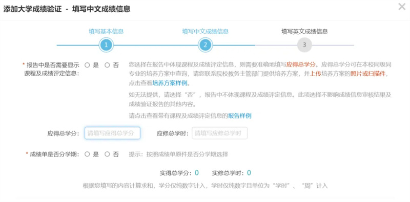 根据提示填写成绩信息,上传成绩单表格,注意要和培养方案与成绩单保持一致。