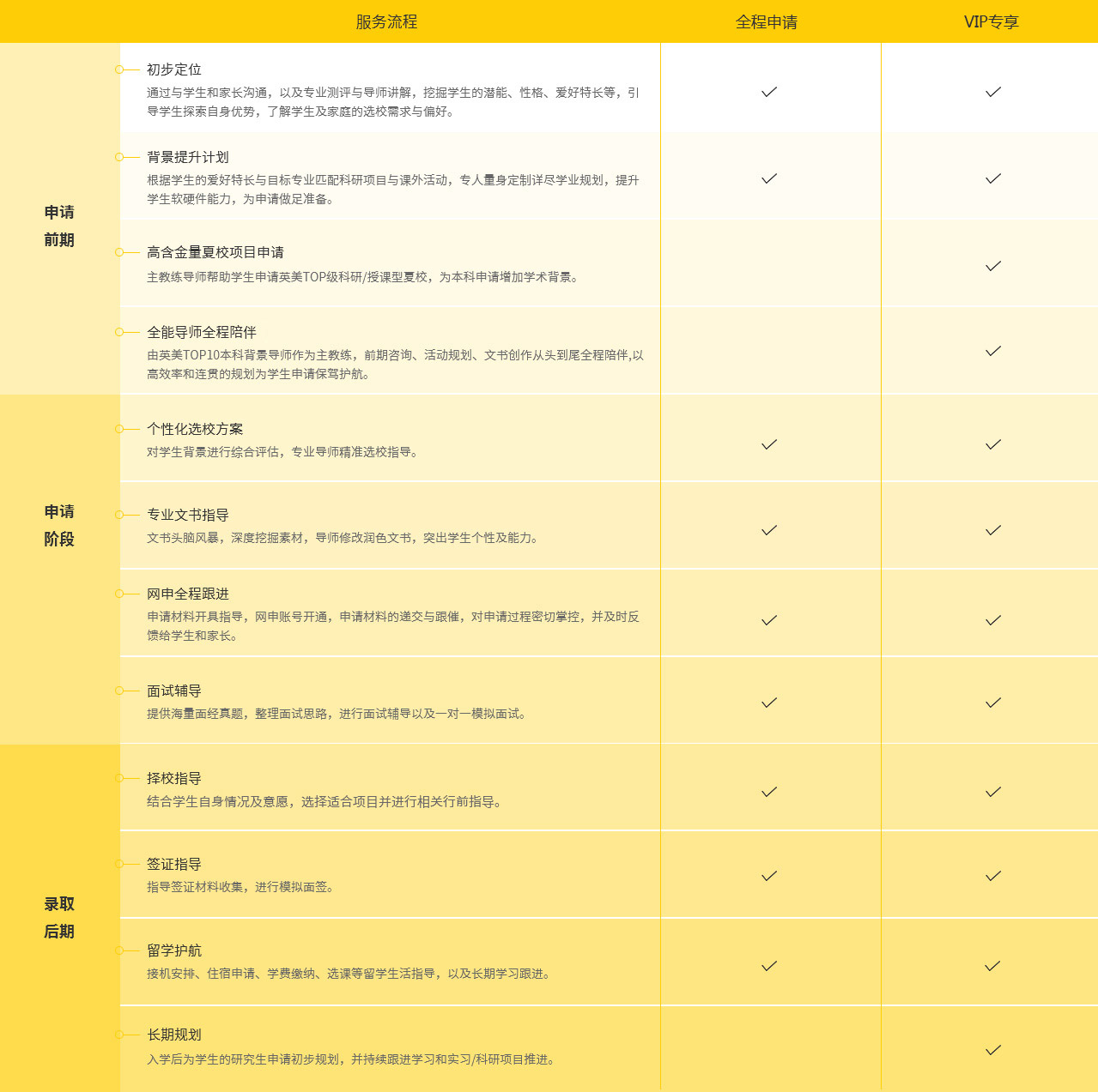 04包括软硬件背景提升、选校定校、文书创作、申请跟进、面试辅导、签证办理等留学申请全过程,为海外申请保驾护航。