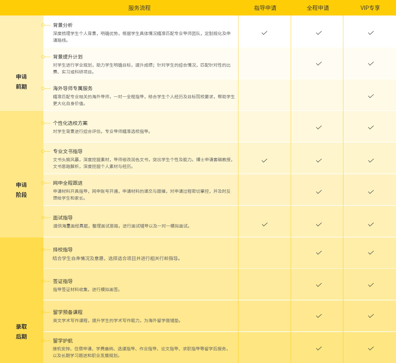包括软硬件背景提升、选校定校、文书创作、申请跟进、面试辅导、签证办理等留学申请全过程,为海外申请保驾护航。